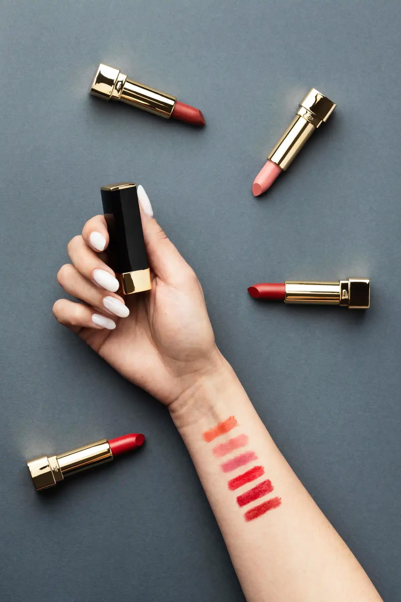 جلوه رنگ و بافت: رژ لب میتواند جلوه مات، نیمهمات یا براق داشته باشد. جلوه مات برای آرایش حرفهای و طولانی مناسب است، در حالی که جلوه نیمهمات یا براق ظاهری طبیعی و نرم ایجاد میکند.